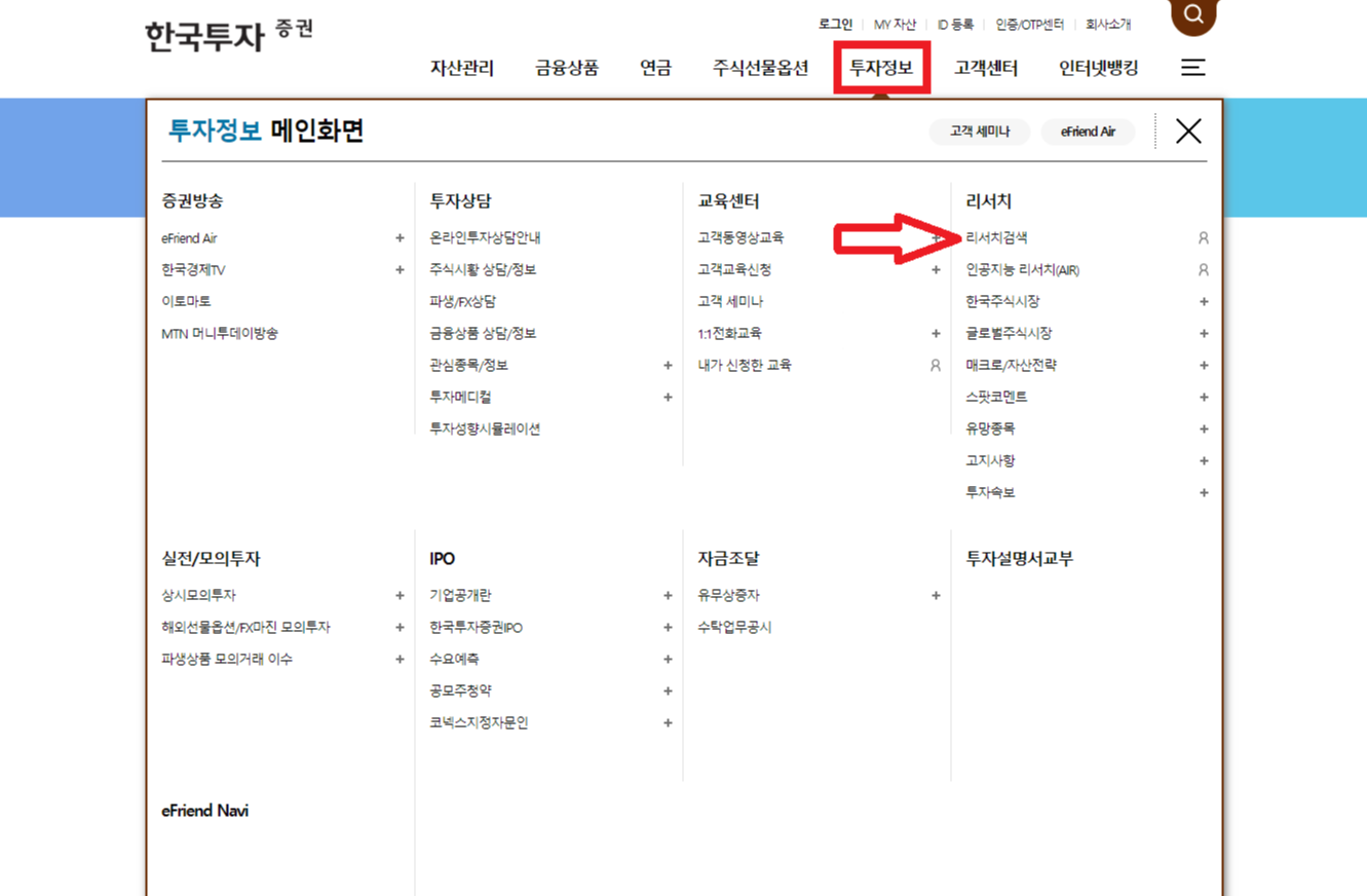 여기서 투자정보 탭에 한국투자 리서치를 누릅니다.