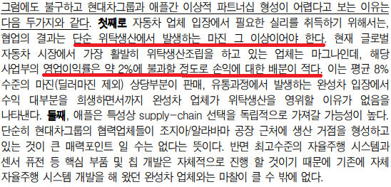 위 사진을 요약해보자면 현대차가 애플카 부품납품업체로 전락하게 되면 영업이익 마진은 2% 대에 불과할 것이고(완성차는 평균 8%) 애플은 경쟁사와 겹치지 않는 독립적인 공급구조사슬을 원하기 때문에 완성차와 마찰이 있을 수 밖에 없다는 것입니다.