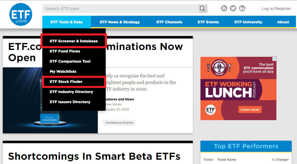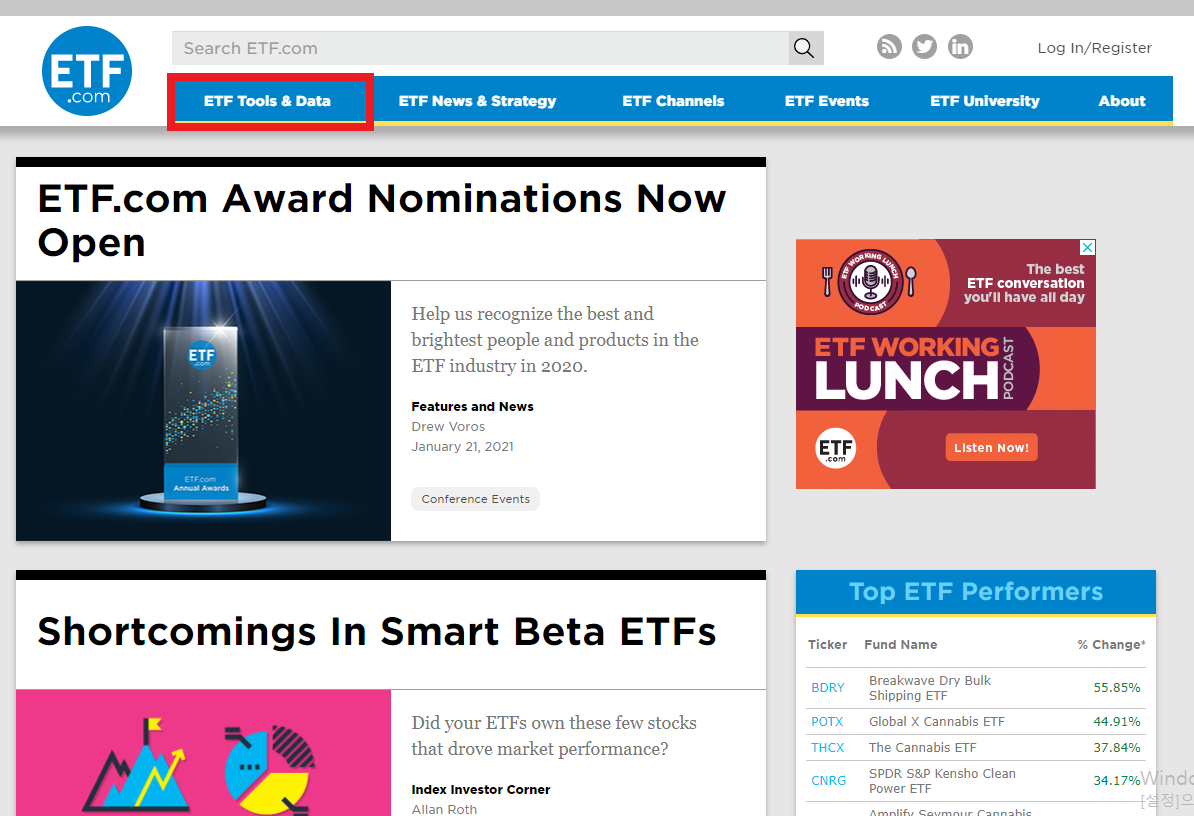 그럼 위와 같이 홈 화면이 뜨는데 빨간색 박스의 ETF Tools & Data에 들어갑니다.