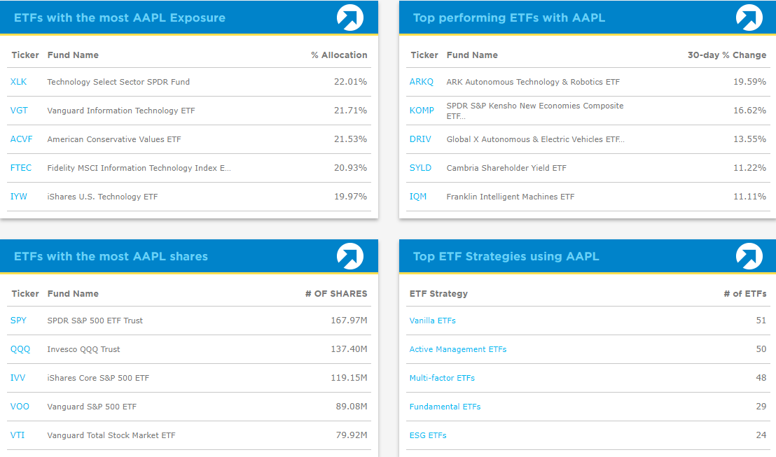 예를 들어 애플(종목코드 : AAPL)을 검색하면 이렇게 어떤 ETF가 애플을 담고 있는지, 많이 담고 있는 순으로도 볼 수 있습니다.