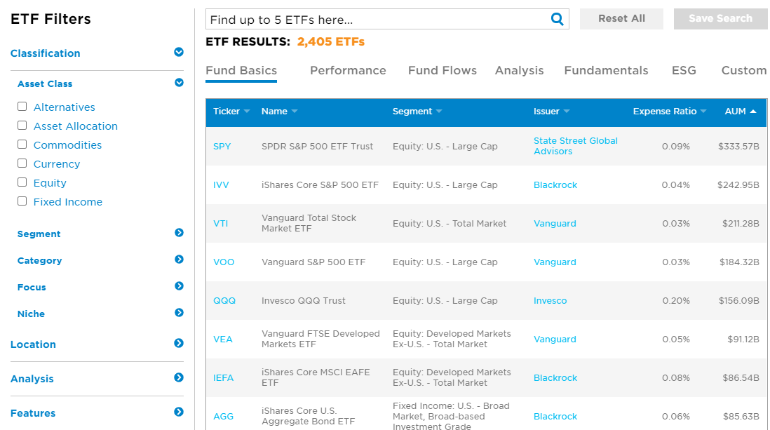 ETF를 종류별로 볼 수 있습니다. 제일 유명한 것들부터 뜨네요. S&P 500, 나스닥 지수 추종 ETF들도 있고, Issuer(발행사), AUM(자산운용규모)도 볼 수 있군요. 자산운용규모가 큰 것이 안전합니다.