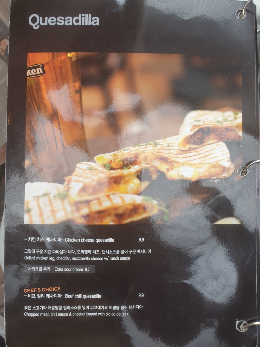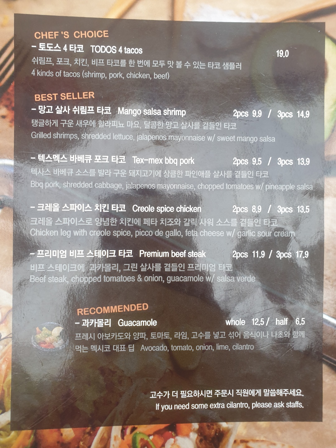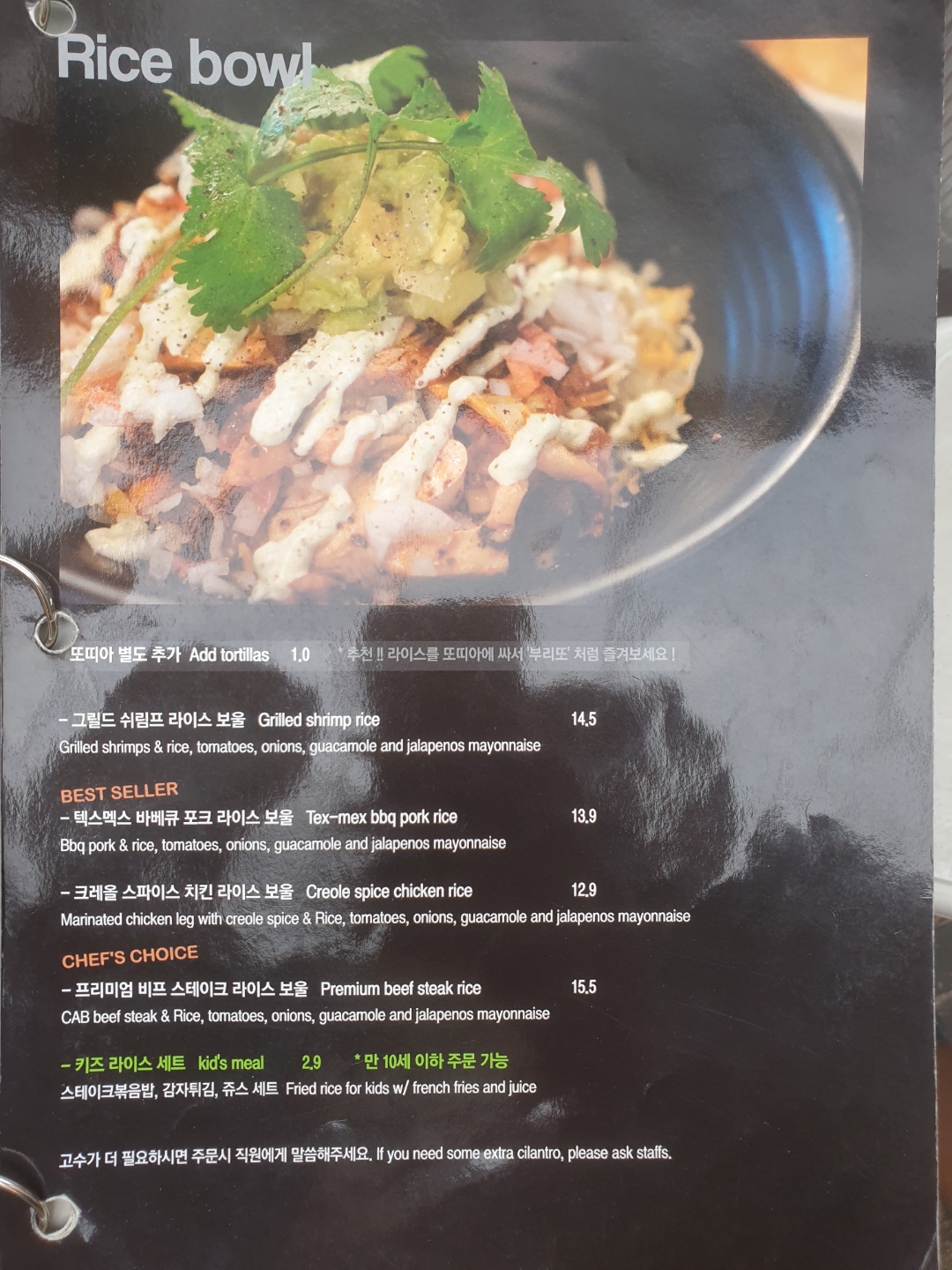 야외에서 찍다보니 빛 반사가 많네요...(타코 / 샐러드 / 고기 / 퀘사딜라 / 볶음밥 / 사이드 디쉬 / 음료) 이 중에 고른다고 생각하면 됩니다.