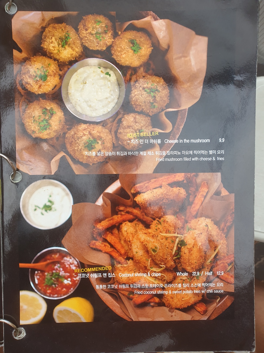 평소에 잘 접하지 않은 메뉴라 꺼려졌었는데 고르길 정말 잘했다는 생각이 드는 메뉴였습니다. 양송이 버섯을 치즈를 입혀 튀긴 것인데 고소하면서 쫄깃하면서 짭잘하면서 하튼... 엄청 맛있습니다.... 제가 픽한 메뉴 중에 원탑이었습니다. 이 메뉴 때문에 재방문 의사가 생겼습니다.