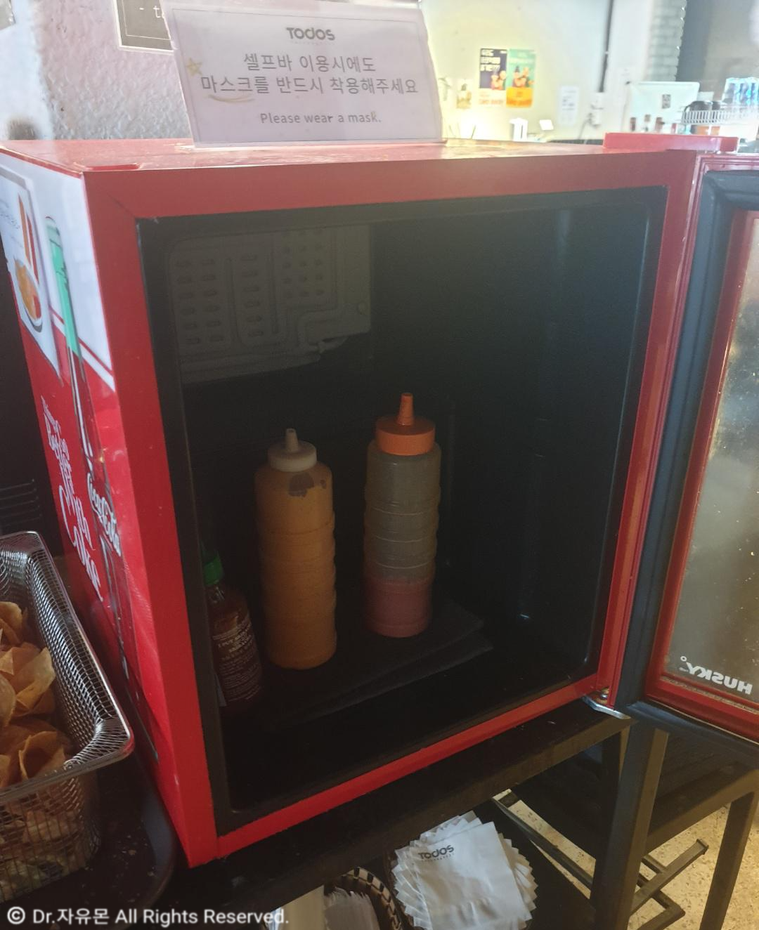 도리토스처럼 생긴 저 과자는 셀프로 담아가면 됩니다. 소스도 뿌려갈 수 있어요.