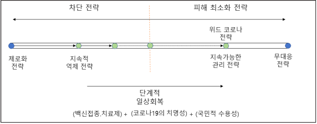 일상적 또는 지속가능한 수준의 역학,의료적 대응으로도 사회적으로 수용 가능한 수준의 코로나19 관리가 가능하여 특별한 규제조치 없이도 일상적인 생활이 가능하도록 하는 과정