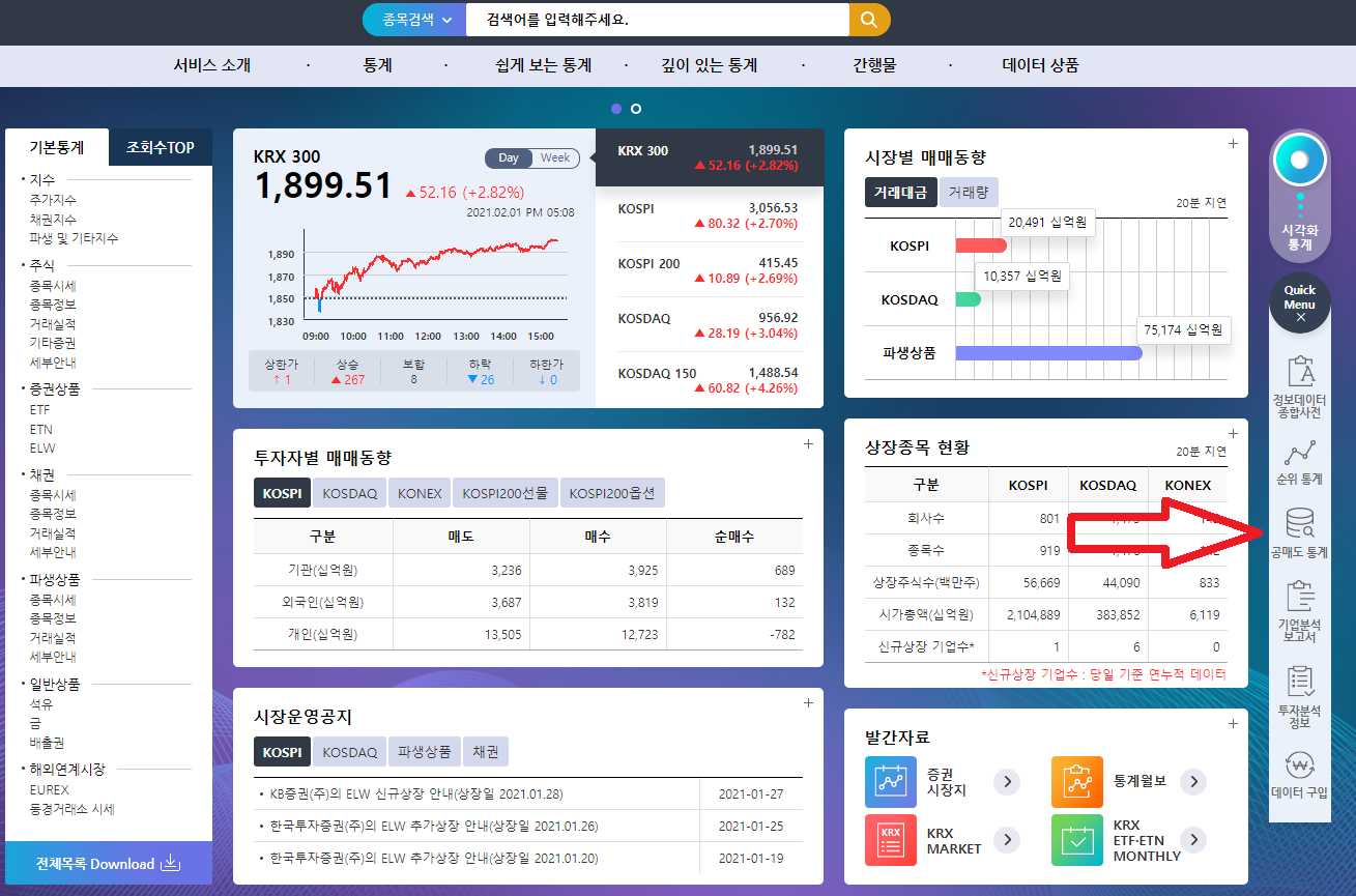 KRX 메인 홈페이지 입니다. 여기서 오른쪽에 공매도 통계 누르시고