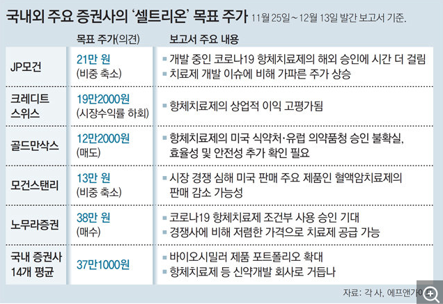 2) 김자현 기자,"‘바이오 대장주’ 셀트리온, 외국계IB-국내증권사 엇갈린 전망", 동아닷컴, 2020-12-14, ‘바이오 대장주’ 셀트리온, 외국계IB-국내증권사 엇갈린 전망 (donga.com)