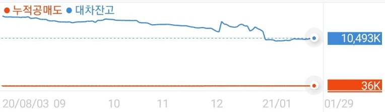 이렇게 모바일 증권앱에서 직접 보는 방법도 있습니다. 한국투자증권 기준으로 거래동향에서 공매도/대차/신용을 보면 됩니다. 공매도는 막혀있으니까 빨간색 선은 볼 필요 없고 대차잔고를 보시면 됩니다. 저게 늘면 공매도 세력이 공매도 치는 포지션(숏 포지션)을 잡고 있다고 보면 됩니다.