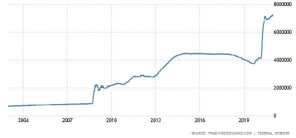 위 그래프는 연준의 양적완화 규모라고 생각하면 됩니다. 우리가 흔히 아는 리만브라더스 사태, 글로벌 금융위기 때 2조 달러였는데 현재 7조 달러입니다. 혹시 양적완화가 익숙지 않은 분들은 다른 포스팅에서 자세히 다룰게요. 일단 미국의 중앙은행 역할을 하는 곳이 돈을 푸는 것이라 생각하면 됩니다. 지금 상황도 코로나가 터지면서 엄청난 유동성 자금들이 풀렸고 주식시장으로 흘러들어 갔죠.