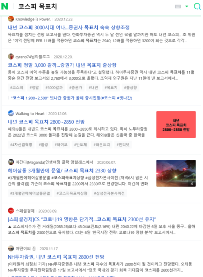 네이버에 '코스피 목표치'라고 치면 작년에 국내외 증권사들이 코스피 목표치를 얼마로 전망했는지 역사가 보입니다. 3월 게시물은 2300, 6월은 2330, 12월 초는 2800 12월 말은 3000, 근데 지금 1.15 종가 기준 3085 심지어 이거 3200 찍고 조정받은 겁니다. 저를 포함한 주식 투자한 분들은 일단 오르니까 씐나긴 했는데, 근데... 언제까지 오를까? 불안한데...