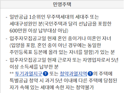 3) 소득기준 만족해야 함, 투기과열지구 또는 청약 과열지역의 주택에 특별공급 청약 시 과거 5년 이내에 당첨된 적이 없어야 함